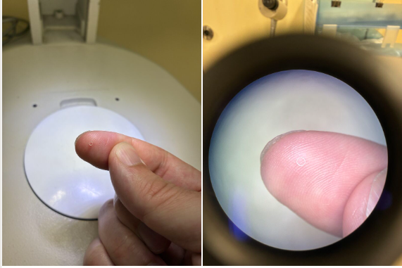 تصویر نشاندهنده قطعه سوزن میکرو قالبگیریشده و خود قالب است، که شامل بین ۱۰۰ تا بیش از ۵۰۰ سوزن فوقالعاده ظریف در یک قطر به اندازه شست دست میباشد. نوک هر سوزن به اندازه φ۰.۰۱ میلیمتر است.